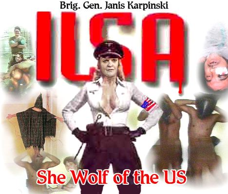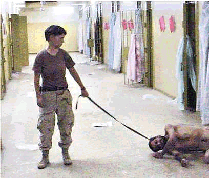 ![]() A naked detainee at the Abu Ghraib prison is tethered by a leash to prison guard Army Pvt Lynndie England in these undated photos. Relatives positively identified England from this photo. These photos were cropped from the waist down for publication purposes. Photo from Information Clearing House Caption from Washington Post |