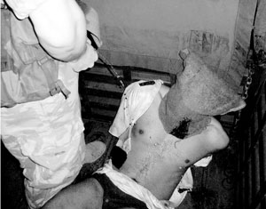 ![]() An Iraqi prisoner and American military dog handlers. Other photographs show the Iraqi on the ground, bleeding. Another image shows that the man, an Iraqi prisoner, is naked. His hands are clasped behind his neck and he is leaning against the door to a cell, contorted with terror, as the dogs bark a few feet away. Other photographs show the dogs straining at their leashes and snarling at the prisoner. In another, taken a few minutes later, the Iraqi is lying on the ground, writhing in pain, with a soldier sitting on top of him, knee pressed to his back. Blood is streaming from the inmate�s leg. Another photograph is a closeup of the naked prisoner, from his waist to his ankles, lying on the floor. On his right thigh is what appears to be a bite or a deep scratch. There is another, larger wound on his left leg, covered in blood. Image, caption, and excerpt are from Seymour M. Hersh, Chain of Command: How the Department of Defense mishandled the disaster at Abu Ghraib, New Yorker, Issue of 2004-05-17, Posted 2004-05-09 www.newyorker.com/fact/content/?040517fa_fact2 |