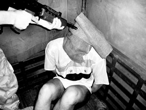![]() Cropped photo of Iraqi prisoner handcuffed in painful position to bed frame, woman's underpants over head. Photo from Information Clearing House Caption supplied by UKAR |
