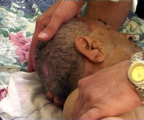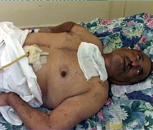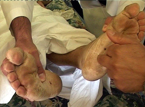 Sadiq Zoman Abrahim, 55 years old, was detained in good health in August 2003 in Kirkuk by US Soldiers during a home raid which found no weapons. He passed successively through the police office in Kirkuk, the Kirkuk Airport Detention Center, the Tikrit Airport Detention Center, and was finally transported by US soldiers to the hospital in Tikrit, and left there under a false name � in a permanent coma. Injuries to his head suggested that he had been severely beaten, and burns to the soles of his feet suggested that he had been subjected to electric shock.![]() Sadiq Zoman Abrahim, 55 years old, lies in a coma in Tikrit hospital. ![]() The back of Sadiq Abrahim's head, showing wounds from a beating. ![]() Sadiq Abrahim's feet, showing burns from electrocution well known to those who lived under the Ba'athist regime. Photographs and captions are from Dahr Jamail, Is the US military torturing Iraqis with electricity? Electronic Iraq, 08-Jan-2004 |