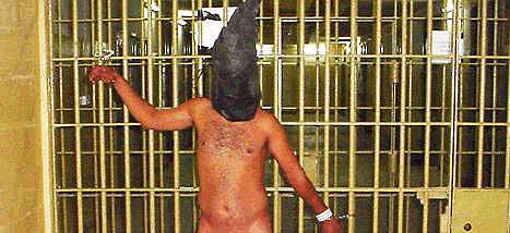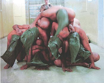![]() A group of men lie naked and bound to one another on the walkway in front of the cells at Abu Ghraib prison in Baghdad. Photo from Information Clearing House Caption from Washington Post |