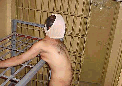 ![]() Cropped photo of standing Iraqi prisoner handcuffed to prison bars. Photo from Information Clearing House Caption supplied by UKAR |