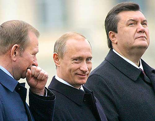 Russian President Vladimir Putin (center) demonstrating his lack of familiarity with European values by appearing three days before the Ukrainian presidential elections between President Leonid Kuchma (implicated in the murder of journalist Heorhy Gongadze) on his right, and presidential hopeful Viktor Yanukovych (implicated in the murder of journalist Ihor Oleksandrov) on his left.