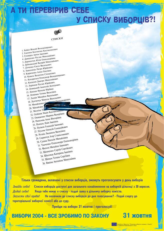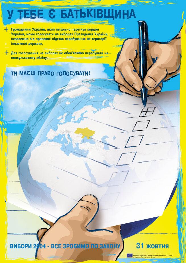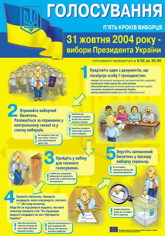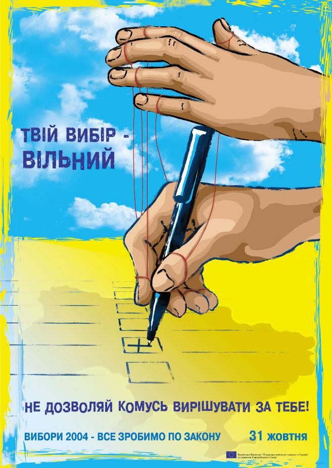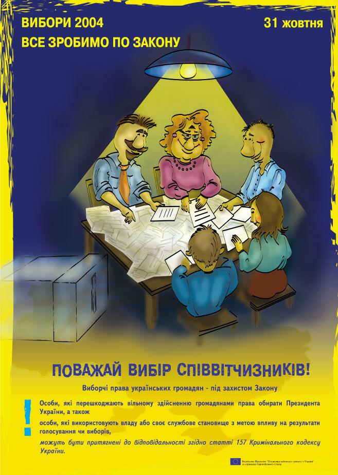 The 125 000 posters mentioned above were of the five originals www.delukr.cec.eu.int/site/page31179.html reproduced below. Although they were prepared for the 31-Oct-2004 vote, they enunciate general principles applicable to all Ukrainian elections, and deserve wide circulation before the 21-Nov-2004 runoff as well. Three voter-education audio clips broadcast by the European Union in Ukrainian are posted at www.delukr.cec.eu.int/site/page31173.html, and are reproduced below: