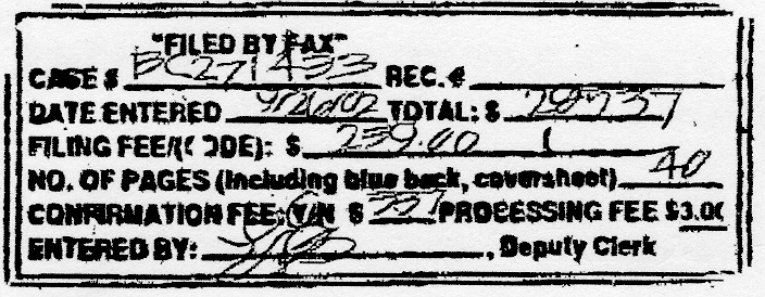 10. Facsimile filing, per document in addition to any other fee imposed by law ... CRC 2006(g) ... $3.00 Plus fee per page of document filed by facsimile ... CRC 2006(g) ... $1.00 Los Angeles Superior Court Fee Schedule, Effective 01-Jul-2002, Civil Filing Fees www.lasuperiorcourt.org/fees/pdf/fee-schedule.pdf. All Los Angeles Superior Court (LASC) fees cited in the instant letters are ones that were in effect on the day that Motion-to-Quash-D was filed on 26-Sep-2002. |
