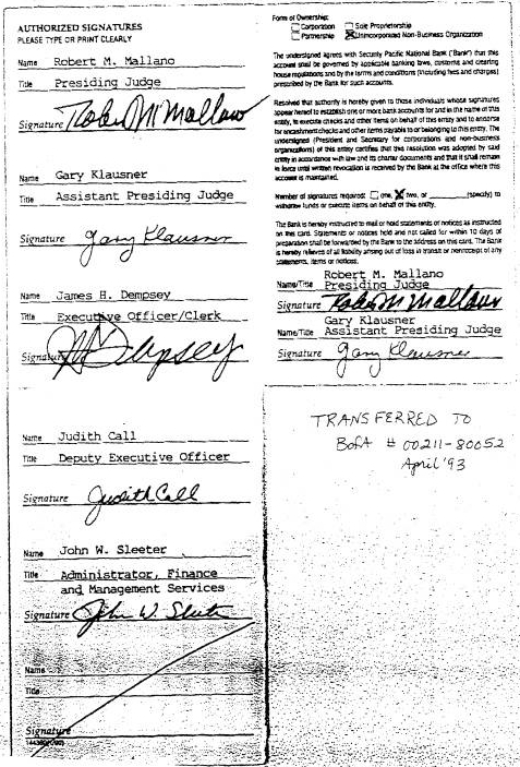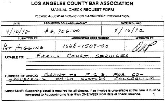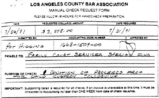 Honorable Sheila Kuehl, Capitol Building #4032 Sacramento, CA 95814 August 3, 2001 Honorable Sheila Kuehl, We are requesting that you assist us in calling for an audit of the LA Superior Court Judges Association and the Superior Court Judges Miscellaneous Expense Fund. It appears from documents included with this letter that the Superior Court Judges Association maintained a checking account, yet neither the IRS nor the County of Los Angeles claim any knowledge of this account. It appears that the Judges Association put on seminars and co-sponsored events with the Los Angeles County Bar Association, and registration fees from these events went into this abovementioned fund. There is a possibility of impropriety that needs to be investigated because the attorneys attending these functions regularly appear in front of these judges, and the checking account seemed to be used for purposes unrelated to court administration. Bank records show that this account reached almost $80,000 in August of 1991. Several of the copies of cancelled checks included with the attached material are for "Cash," and the amounts are not trivial. The small number of checks for cash that CA NOW was able to obtain total over $4,000. In addition, there are checks to country clubs and jewelry stores. Further questions are raised by numerous checks by Los Angeles attorney made out directly to the "Judges Trust Fund." Given that the account appears to have been used for personal reasons, it seems highly improper for practicing attorneys to be paying money into this checking account. In 1997, after Insight Magazine published an expose on the checking account, the Judges filed articles of incorporation. The address of the nonprofit, however, is the Central Courthouse in Los Angeles. CA NOW questions whether is it appropriate for the judges of the Superior Court to be operating a private nonprofit corporation out of a county government building. The name on the articles of incorporation and the checking account is the LA Superior Court Judges Association. It appears, however, that this account may be a continuation of the Miscellaneous Expense Fund, since the Bank of America records indicate that the Association has been a member since 1962, despite being incorporated in 1997. Regardless of whether this account is the same as the Miscellaneous Expense Fund, the use that this account was put to raises even more questions. It appears from the attached documents that attorneys wishing to be employed as Child Visitation Monitors were required to complete a class offered by the Court. Attorneys attending these classes made out checks to the "Family Court Services Spec. Fund" but the checks were deposited into the LA Superior Court Judges Association checking account. In an effort to gather as much information as possible, the various administrative departments in Los Angeles County were ask to identify any records they had of the LA Superior Court Judges Association. The County Counsel for Los Angeles responded that there were no records transferring the right to use the County tax payer ID number to the LA Superior Court Judges Association, nor is there any record of a fictitious name state having been filed. It appears that the County of Los Angeles has no knowledge of the LA Superior Court Judges Association. Obviously this is a complex matter. CA NOW does not have the resources to fully investigate this matter, and is hesitant to make allegations. The appearance, however, is that a group of judges within the Los Angeles Superior Court are operating a checking account and a business that is essentially "off the books," with no oversight from any regulatory agency, and receiving money from attorneys who are practicing in their courtrooms. To those of us on the outside, this appears highly improper, if not illegal. For these reason, we respectfully ask for your help seeking an audit. [...] Sincerely, Helen Grieco CA NOW Executive Director California National Organization for Women canow.org/famlaw_report/audit_ltr.pdf Bold emphasis added. |