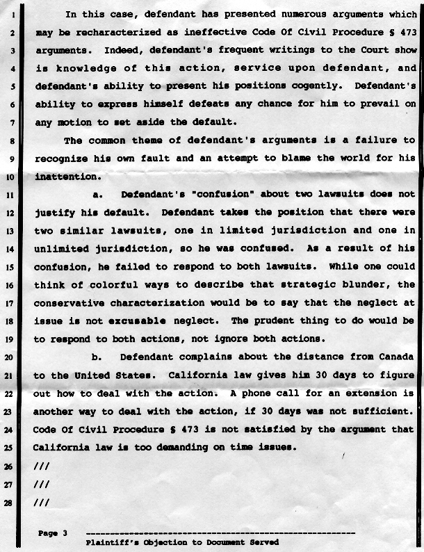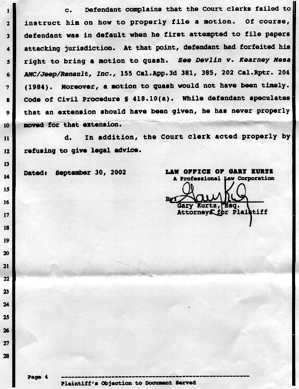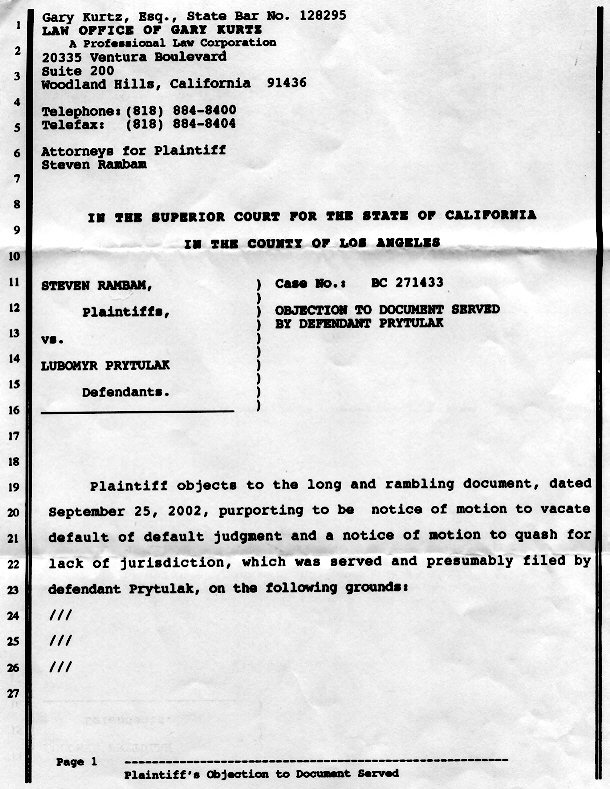 to Lubomyr Prytulak Motion-to-Quash-D This Rambam-Objection-D1, dated and postmarked 30-Sep-2002, filed by the Court 01-Oct-2002, and delivered to Lubomyr Prytulak by mail 04-Oct-2002, objects to Prytulak Motion-to-Quash-D filed by the Court 26-Sep-2002. Lubomyr Prytulak replies to this Rambam-Objection-D1, and to a later Rambam-Objection-D2 as well, in his Prytulak-Reply-D3, dated 05-Nov-2002 and delivered to the Court by FedEx 07-Nov-2002. ![]() ![]() ![]() ![]() HOME DISINFORMATION PEOPLE RAMBAM KLAUSNER DUNN L.A. JUSTICE |