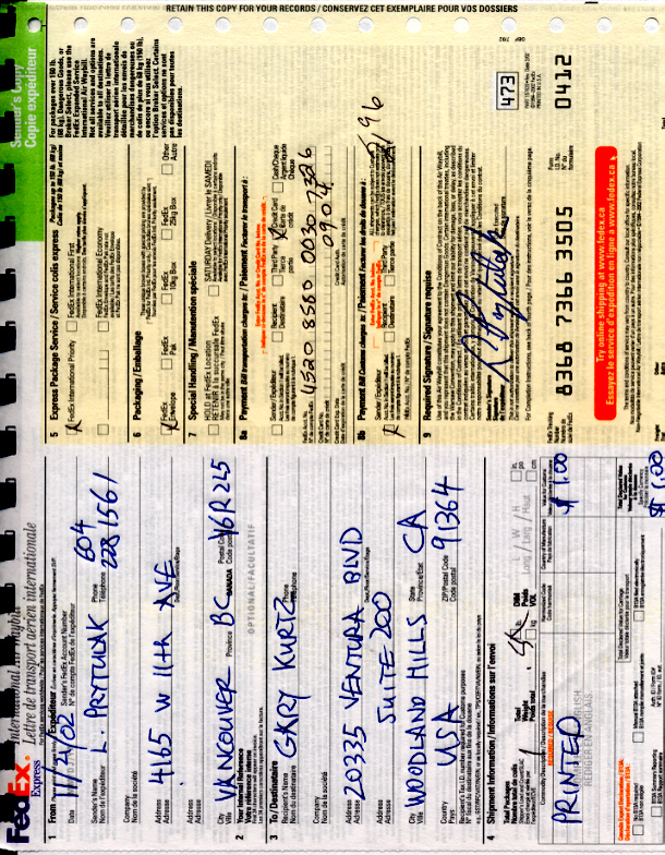 Tracking Number 831625250376 Reference Number Ship Date 08/29/2002 Delivered To Recept/Frnt desk Delivery Location WOODLAND HILLS, ENCINO CA Delivery Date/Time 08/30/2002 09:43 Signed For By G.KURTZ Service Type Priority Box Can be verified in greater detail at: http://www.ukar.org/temp/fedex/fx020830a.htm |