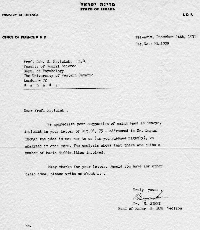 Reply from Dr. M. Simhi, Head of Radar & ECM Dec 24/73
