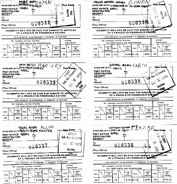 The six registration receipts below indicate that the Dayan letter was mailed on Oct 26/73 from London Ontario and was addressed to six people, moving from left to right, top row to bottom: