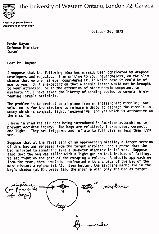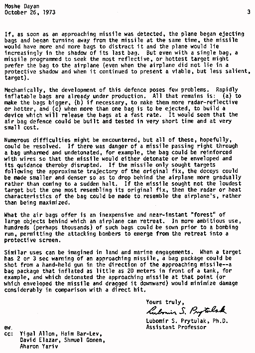 Airbag letter to Israeli Defense Minister Moshe Dayan