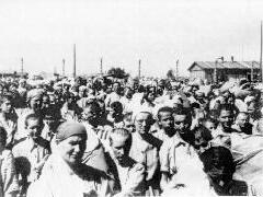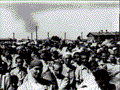 Hungarian arrivals after the "Selektion" at Auschwitz. As these prisoners were being processed for slave labor, many of their friends and families were being gassed and burned in the ovens in the crematoria. The smoke can be seen in the background. Date: June 0, 1944 Era: During WWII Copyright � 1997, The Simon Wiesenthal Center 9760 West Pico Boulevard, Los Angeles, California 90035 |